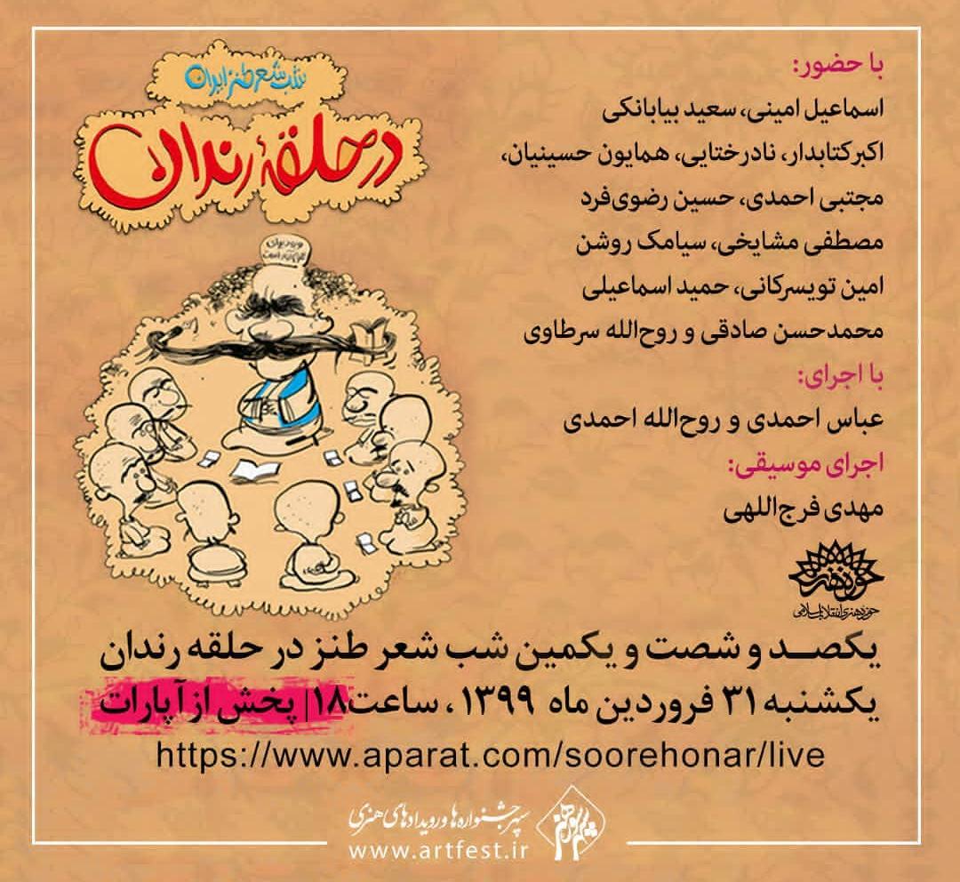 «در حلقه رندان» به همت موسسه فرهنگی و هنری سپهر سوره هنر و دفتر طنز حوزه هنری برگزار میشود. همانگونه که پیش از این گفته شد؛ جهت پیشگیری از شیوع بیشتر بیماری کرونا در حلقه رندان به صورت حضوری پذیرای ادب دوستان گرامی نخواهد بود و علاقهمندان میتوانند این برنامه را به صورت آنلاین از طریق سایت آپارات ببینند.