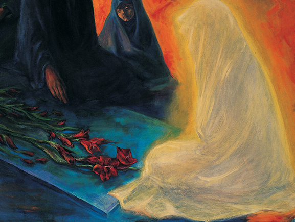تابلوی بهشت زهرا از اولین آثارعبدالحمید قدیریان می باشد که تحت تأثیر فضای فرهنگی آن روزهای انقلاب کشیده شده اشت و به حضور قدسی حضرت زهرا سلام الله علیها اشاره دارد.