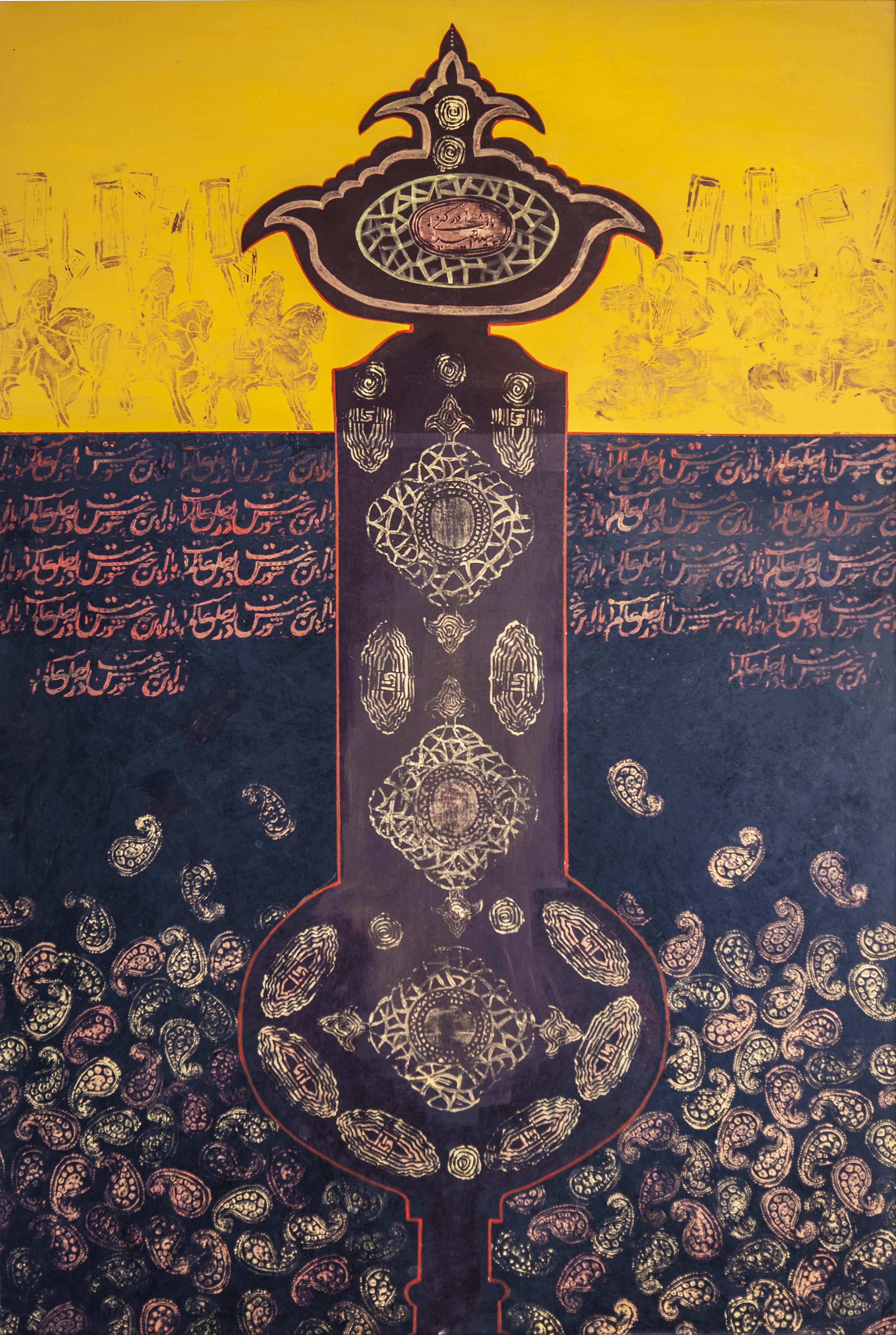 این هنرمند نقاش درخصوص تکنیک اثری که ارائه دادهبود گفت: این اثر را با تکنیک چاپ دستی خلق کردم چنانکه در جای جای اثر شاهد چاپ گل و مرغهایی با طرح دوره قاجار و پهلوی هستیم که در قابهای مختلف به رنگ خاکستری هستند، اما قابی که دارای نماد علم که نمادی از عاشوراست، در آن قرار دارد، طرح گل و مرغ در آن بخش رنگی میشود. به این معنا که با ورود نمادی از امام حسین (ع)، گل و مرغها رنگ بهشت میگیرند و از برزخ خارج میشوند.