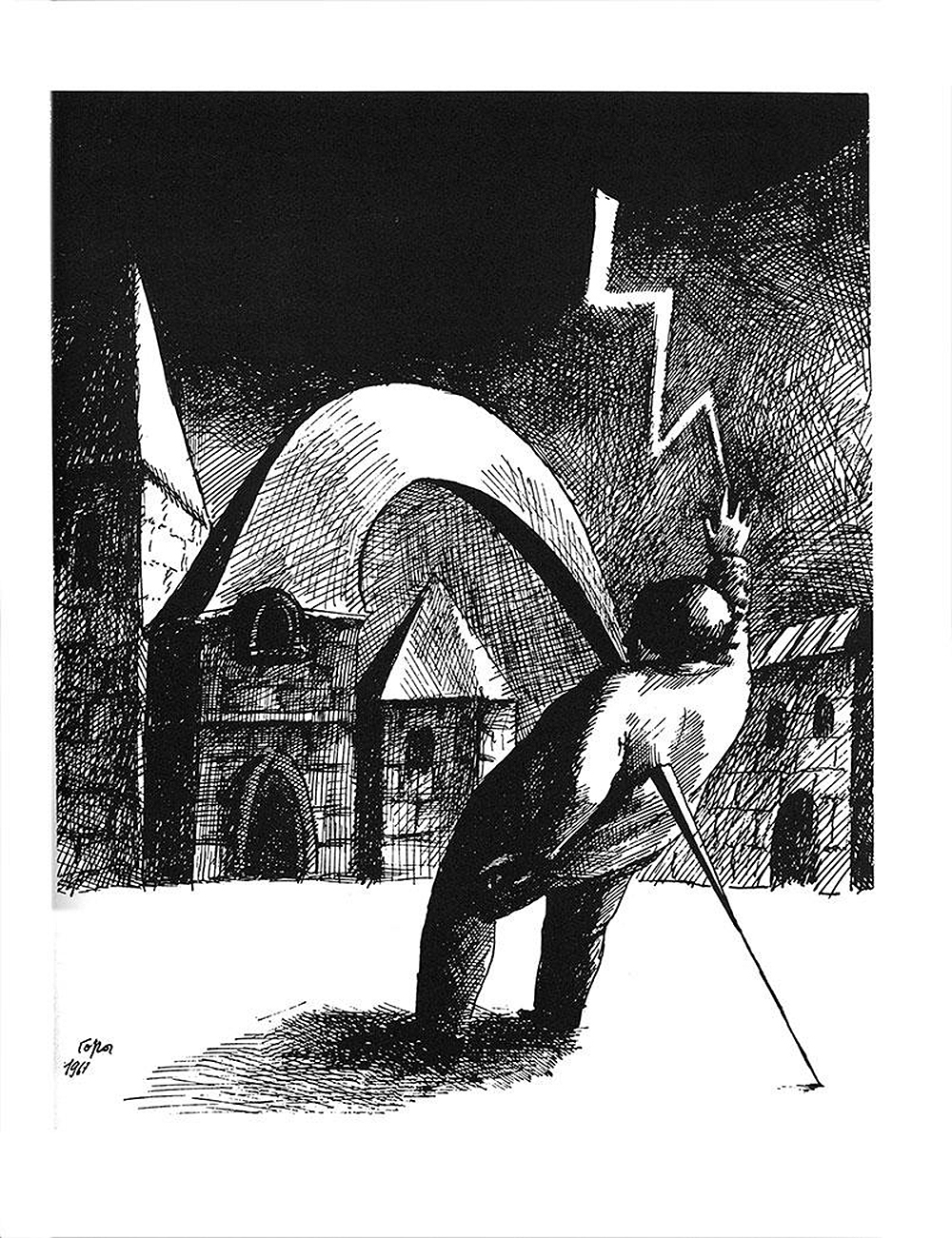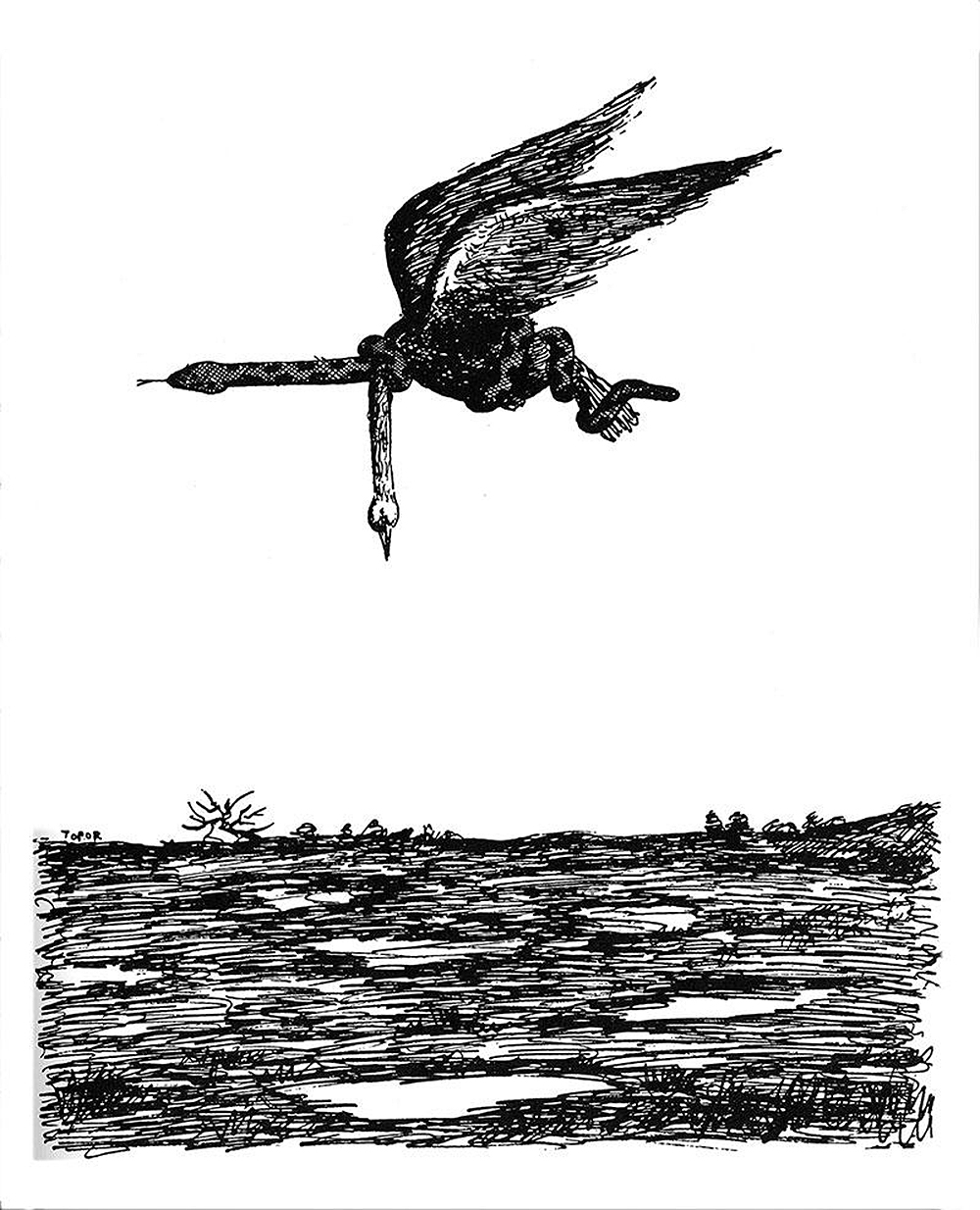 دنیا از دید توپور ترسناک و غیر قابل اعتماد است، حتی جنسیت و عشق هم دردناک و دلهره آورند، نه لذت بخش یا عامل رستگاری. او این اضطراب را با خلق دنیایی سیاه و سورئال نشان می دهد، سورئالیسم او از جنس غریب ترین کابوس های بشری است و نه رویا؛ که انگار رویای فرهنگ و تمدن اروپایی بعد از جنگ جهانی دوم به کابوس تبدیل شد. او به همراه “فرناندو آرابال” شاعر اسپانیایی و “آلخاندرو خودوروسکی” فیلسوف شیلیایی در سال ۱۹۶۲ “جنبش وحشت” را پایه گذاشت تا سورئالیسم را به حرکتی شوک آور و تأثیرگذار بر مخاطبین تبدیل کند. شیوه طراحی توپور به طرز شگرفی قدیمی و کلاسیک می نماید، مثل طراحی ها و تصویرسازی های قرن هجده و نوزده که همین، آنها را رمز آمیزتر می کند و حسی تاریخی به ترس هایش می دهد، همان حسی که تماشای فضا سازی های “بری لیندون” استنلی کوبریک در ما ایجاد می کند، هر دو هنرمند بدبین، ورای تاریخ، تمدن و آیین، شمایل موجود غارنشینی را می بینند که بدویت اش را نقاب می گیرد. هر دو نقاب ها را می درند.