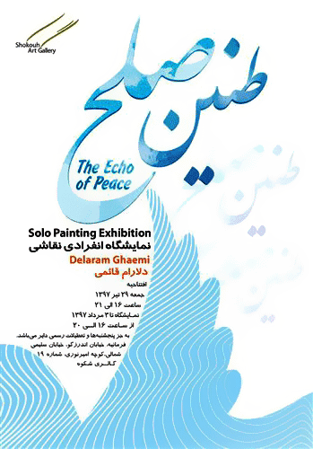 به گزارش روابط عمومی مرکز تجسمی حوزه هنری، آیین افتتاحیه نمایشگاه انفرادی نقاشی دلارام قائمی با عنوان «طنین صلح» روز جمعه ۲۹ تیر ماه ساعت ۱۶ تا ۲۱ در گالری شکوه برگزار میشود.