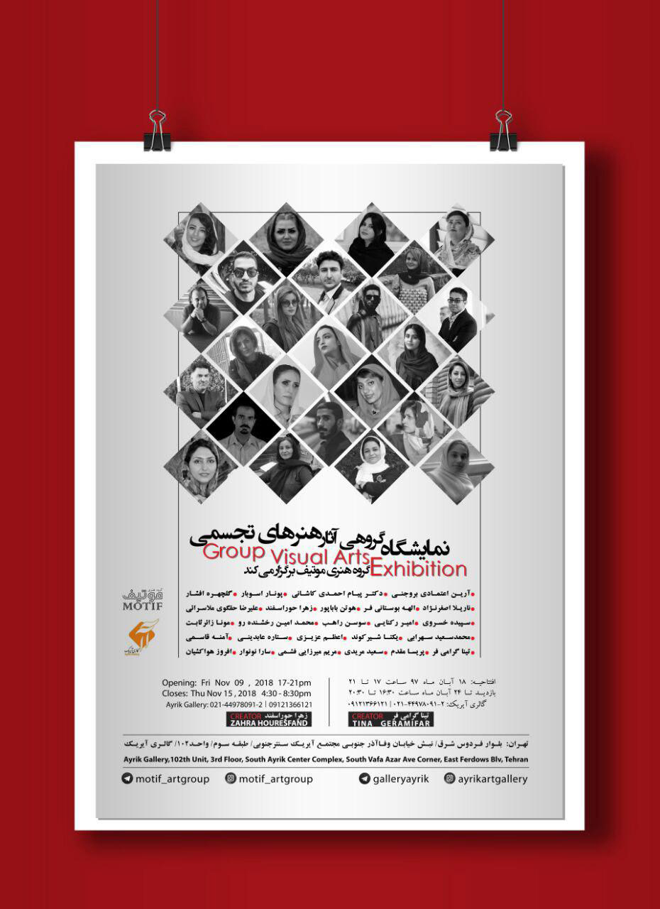 نمایشگاه گروهی آثار هنرهای تجسمی گروه «موتیف» روز جمعه مورخ ۱۸ آبان ماه 97 افتتاح شد و تا ۲۴ آبان ماه از ساعت ۱۶:۳۰ تا ۲۰:۳۰ پذیرای علاقمندان است.