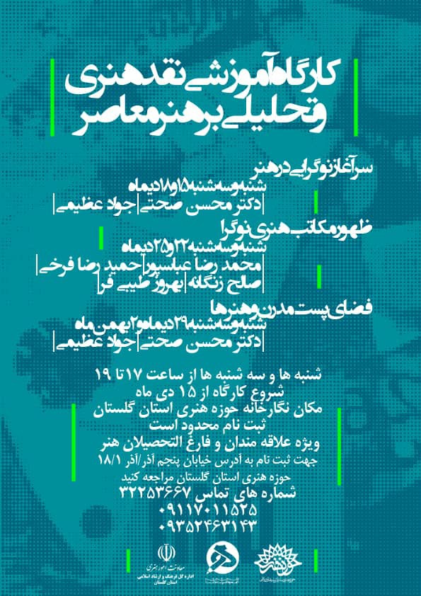 به گزارش روابط عمومی حوزه هنری انقلاب اسلامی استان گلستان؛ مسئول واحد هنرهای تجسمی این مرکز درباره خبر فوق گفت: کارگاه تئوری هنرهای تجسمی با استقبال فعالان این عرصه هنری در روزهای یک شنبه و سه شنبه به مدت 5 هفته برگزار می شود.