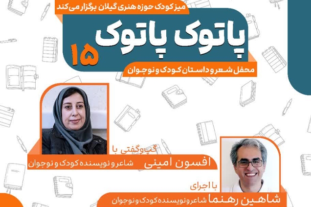 پـــــاتوک پـــــاتوک ۱۵، محفـل شعـر و داستــان کـودک و نـوجــوان با حضور علاقهمندان به ادبیات کودک و نوجوان در استان گیلان و سرکار خانم افسون امینی (شاعر و نویسنده کودک و نوجوان) ســهشــنبه ۲۷ آبانماه ۱۴۰۴